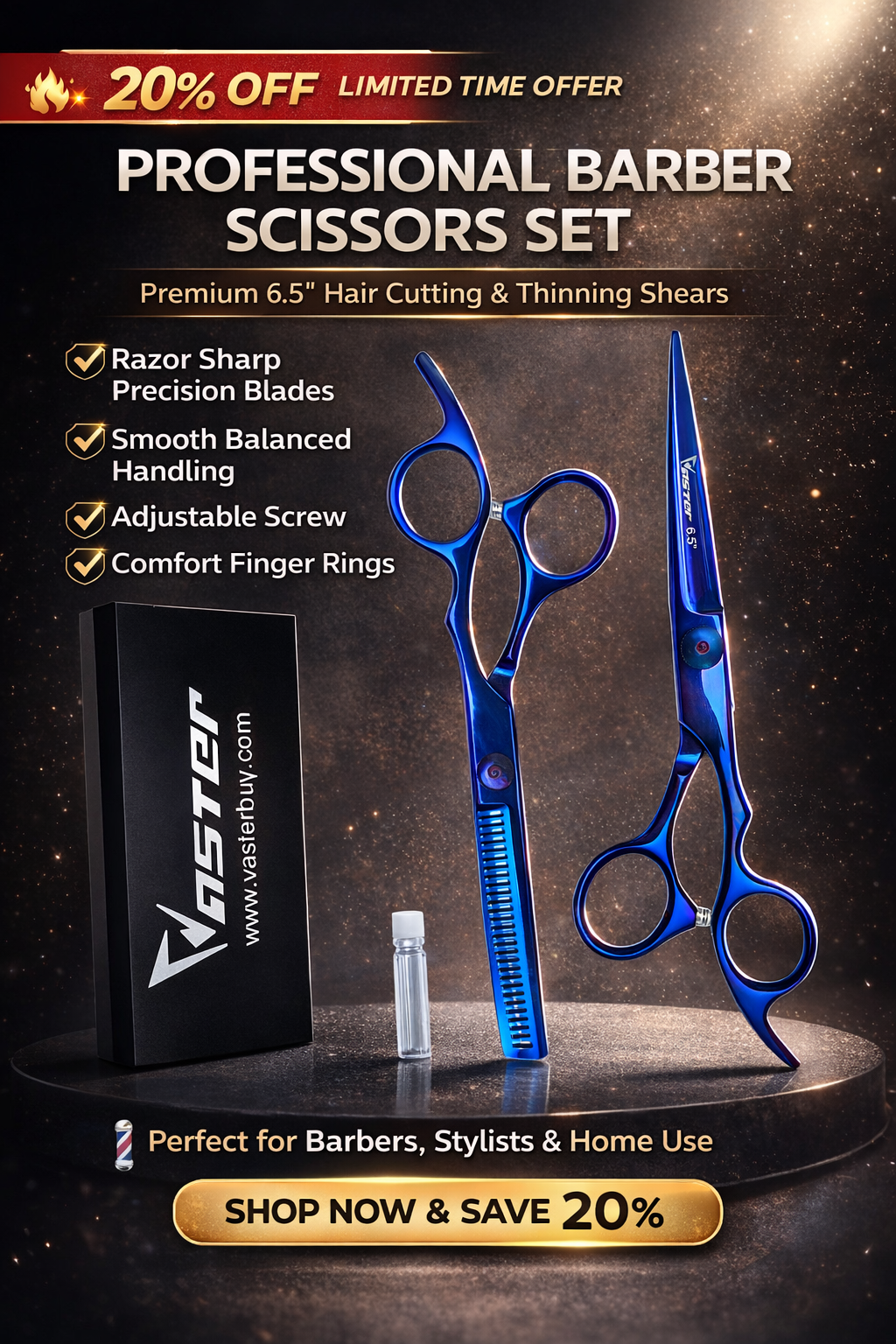 Upgrade your hair cutting experience with the Vaster Professional Hair Scissors Set, designed for barbers, hairstylists, and home users who want precision, comfort, and durability. This premium kit includes 6.5-inch hair cutting scissors and thinning scissors, making it perfect for trimming, styling, and texturizing all hair types.